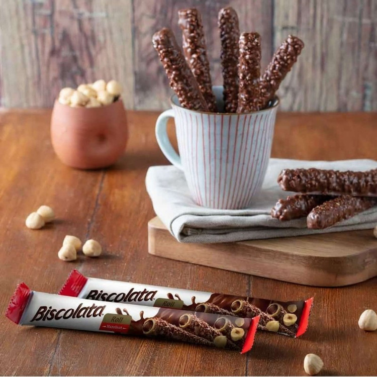 شکلات بیسکولاتا رولی با مغز شکلات و فندق 28 گرمی بسته 12 تایی